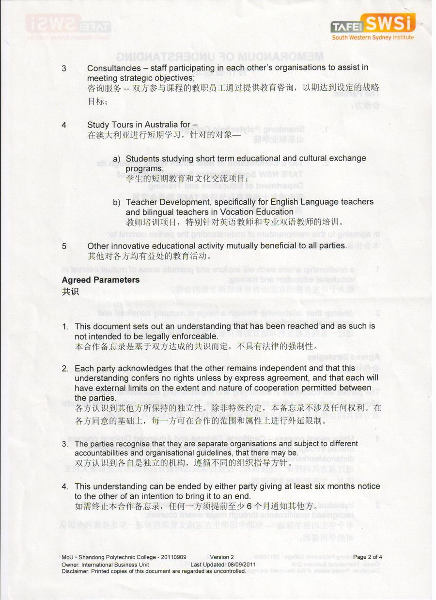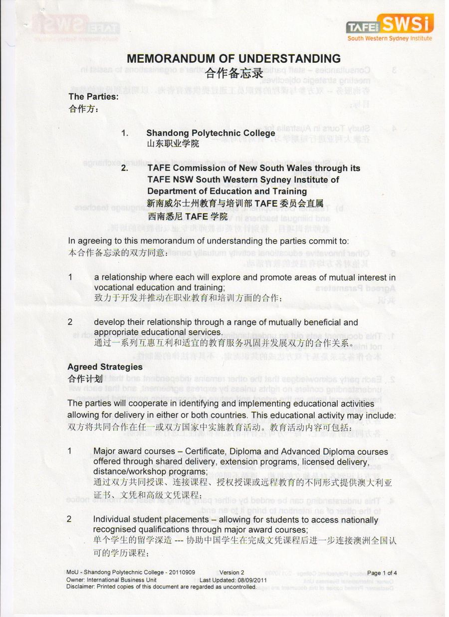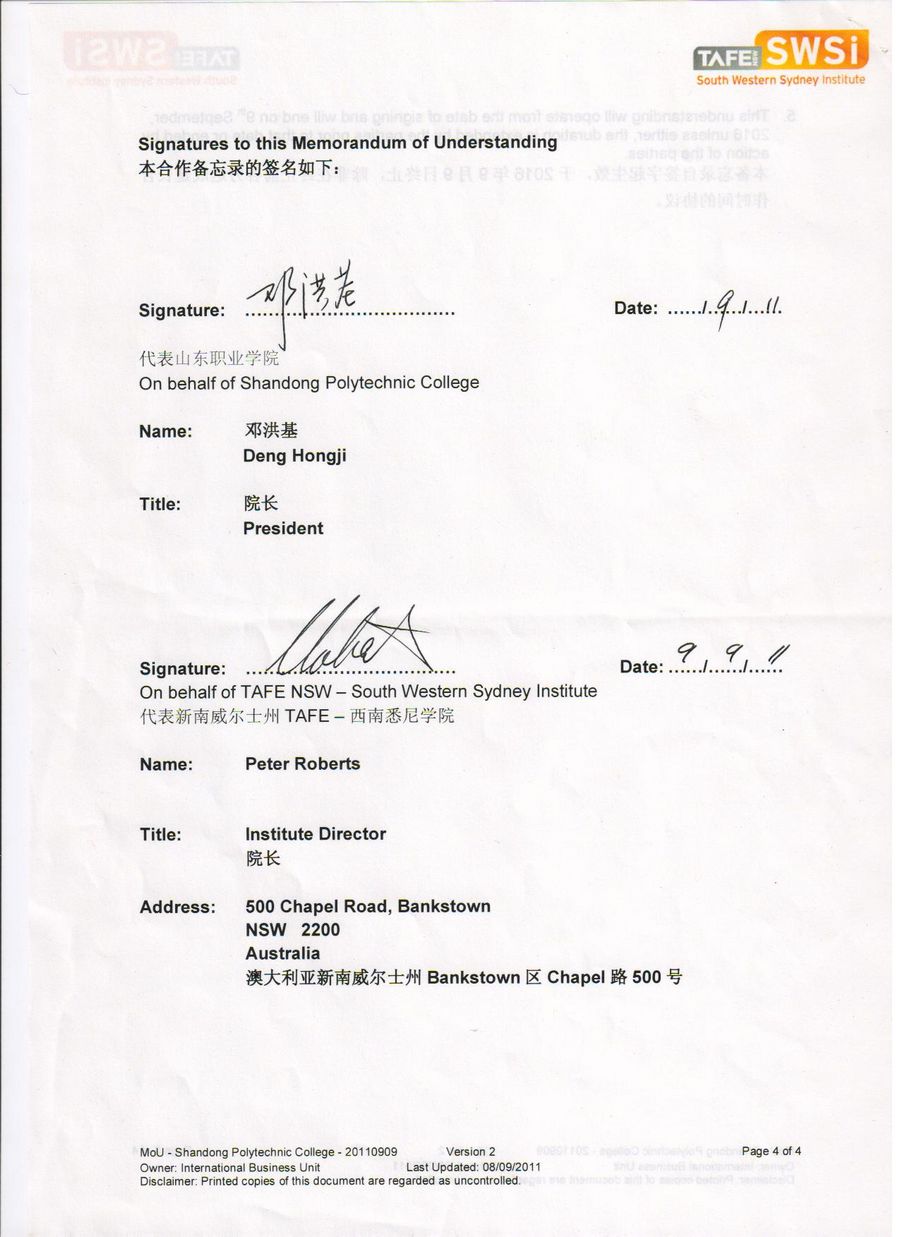 山东职业学院与西南悉尼TAFE学院合作备忘录