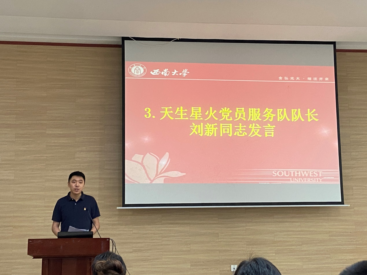 第一阶段,学院领导为天生星火党员服务队举行换届仪式。院长黄晓灵宣读天生星火党员示范班和服务队组织机构名单,党委书记郭立亚向天生星火党员示范班班长、服务队队长刘新授旗,刘新发表接旗感言。