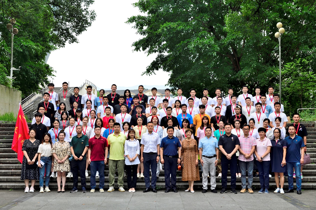 活动结束后,学院领导和全体毕业生党员在体育学院外合影留念
