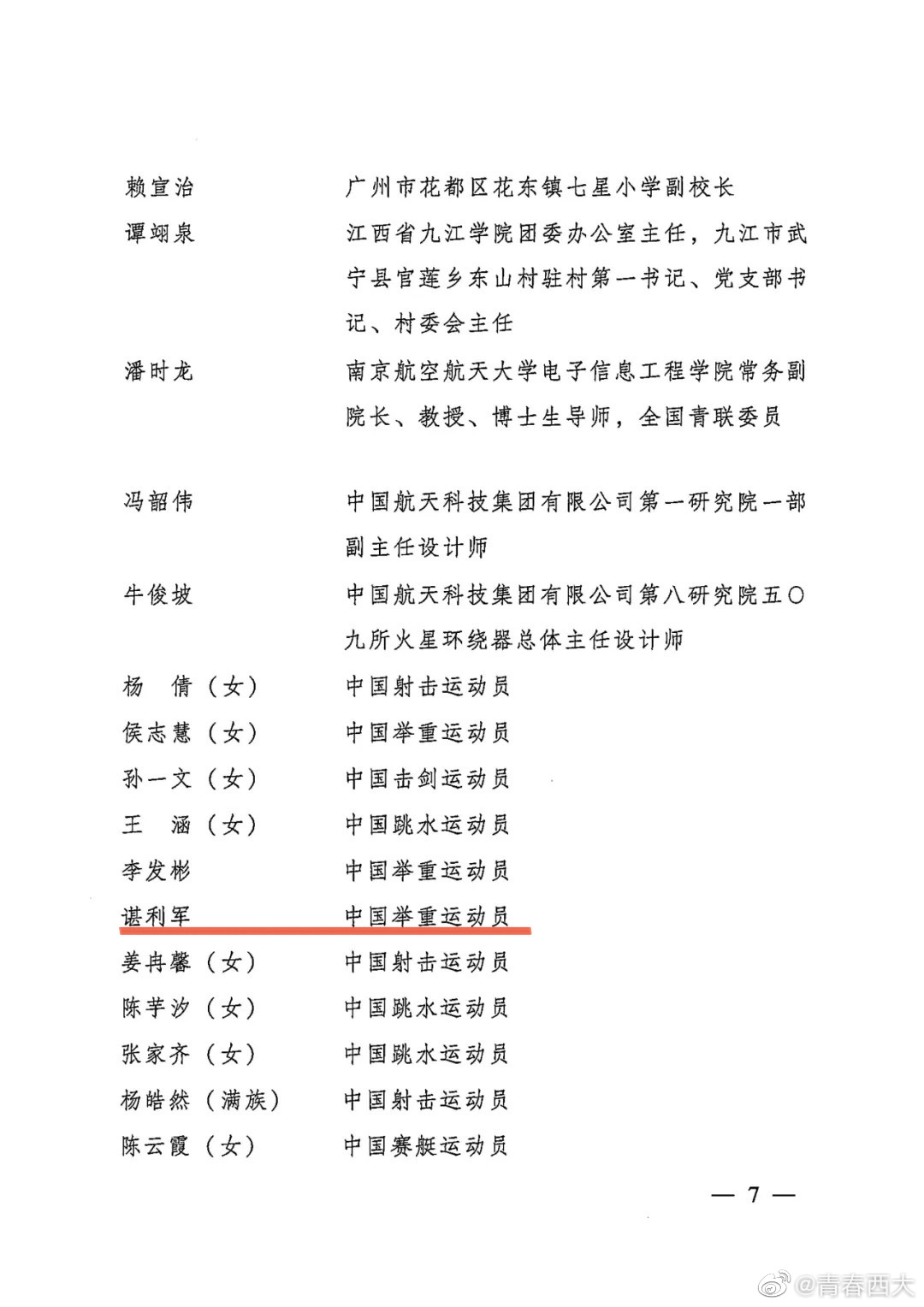 在五四青年节来临之际,共青团中央、全国青联共同颁授第26届中国青年五四奖章表彰青年中的优秀典型和模范代表。其中我院2018级研究生、中国举重运动员谌利军荣获“中国青年五四奖章”荣誉称号。同时他的事迹也入围了由中国青年报主办的“新时代新青年[有为·无畏]”主题展,与武大靖、孟庆旸、吴南、江梦南、裴先峰等54位中国青年代表共同入围,展现了新时代中国运动员的青春力量和西大学子的青春风采。