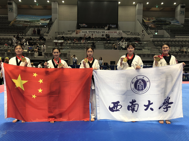 2018年世界大学生跆拳道锦标赛赛场再次传来喜讯:代表中国大学生出战的西南大学跆拳道队5名女队员勇敢拼搏,夺得女子团体冠军,为中国代表队收获此次赛事的第六块,也是最珍贵的金牌。