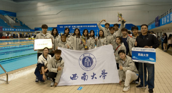 近日,为期4天的第23届中国大学生游泳锦标赛(南方赛区)在遵义市奥体中心落幕。我校运动员发挥出色,共15名运动员在领队黄晓灵和教练员周维臻、秦宇婷的带领下,奋勇拼搏,收获10枚金牌、7枚银牌、6枚铜牌,丁组和丙A组运动员全部闯入总决赛。团体方面,获得男子丁组团体总分第三名、女子丁组团体总分第二名和丁组团体总分第二名的优异成绩。
