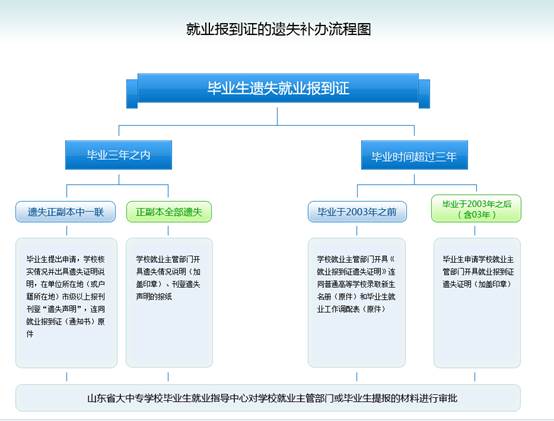 其中:2003年(含)以后毕业的,由毕业生持加盖学校印章的就业报到证遗失证明,到山东省人社厅办理;2003年以前毕业的,由学校持加盖印章的《就业报到证遗失证明》、普通高等学校录取新生名册(原件)和毕业生就业工作调配表(原件),到山东省人社厅办理。