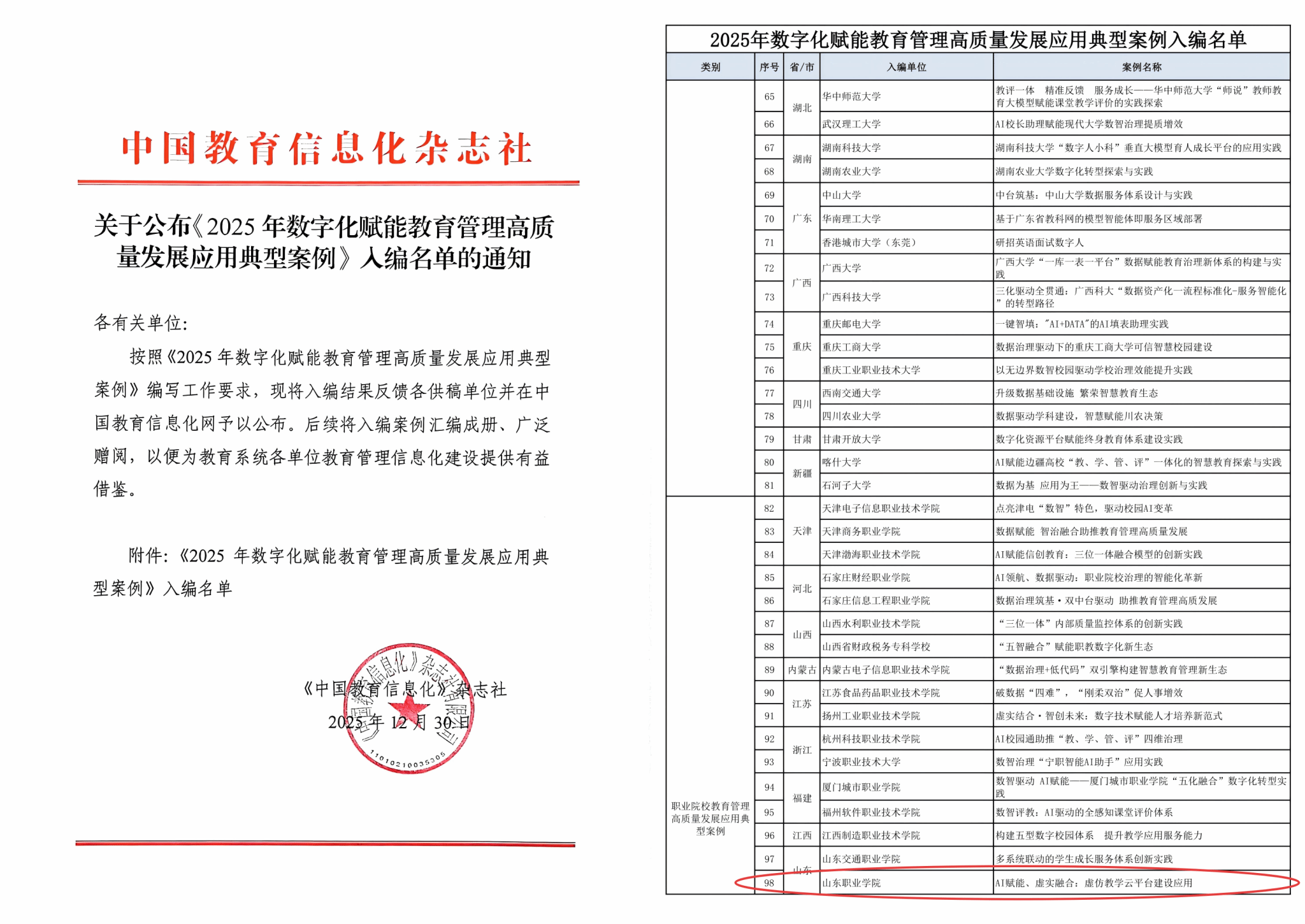 近日,由教育部主管的《中国教育信息化》杂志社公布了《2025年数字化赋能教育管理高质量发展应用典型案例》入编名单,我校报送的《AI赋能、虚实融合:虚仿教学云平台建设应用》成功入选。