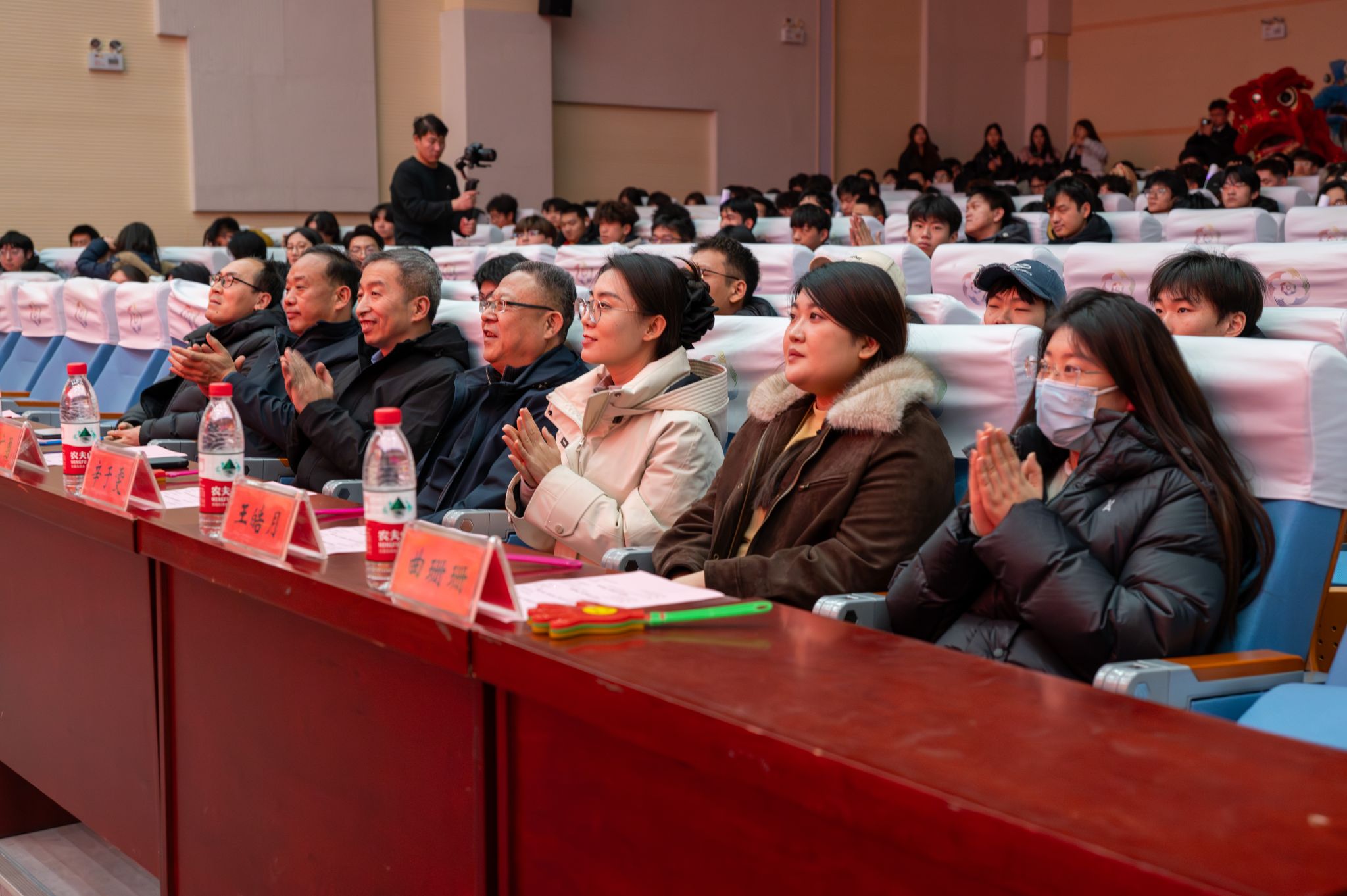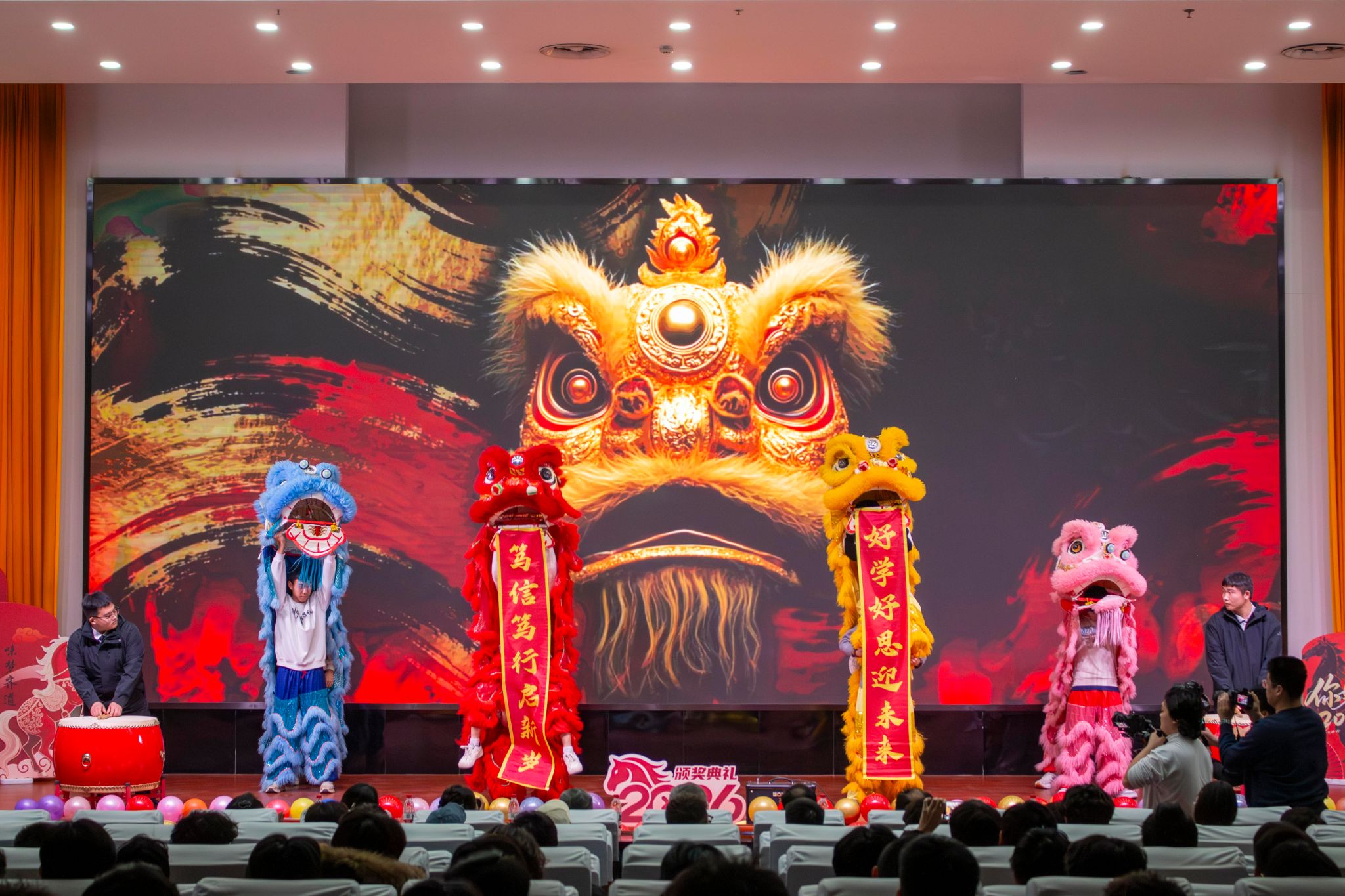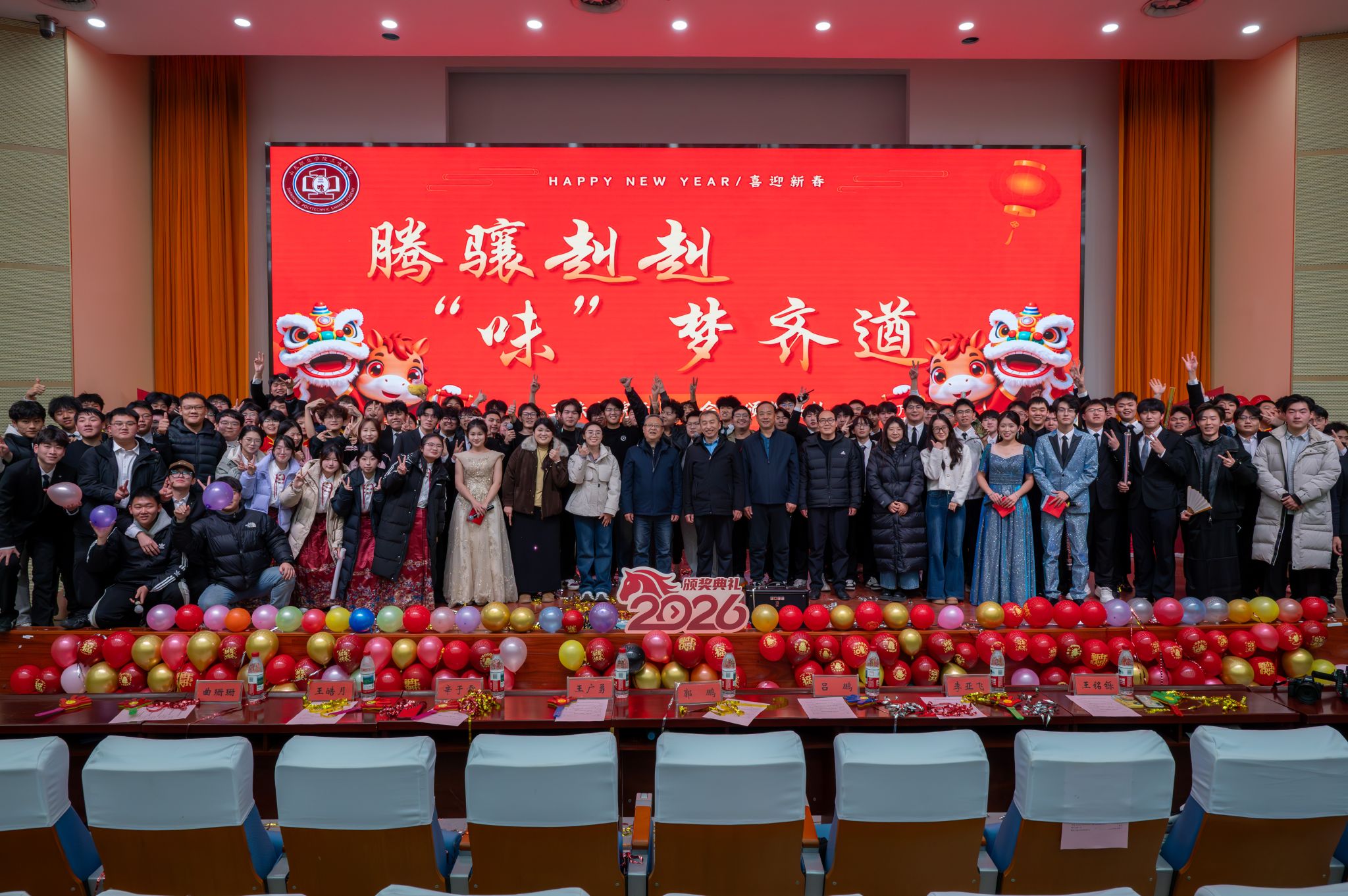 为庆贺元旦佳节、表彰书院先进典型、凝聚师生奋进力量,12月29日,三味书院在图书行政楼西报告厅举行“腾骧赳赳,‘味’梦齐遒”2026年元旦晚会暨颁奖典礼。我校党委副书记郭鹏、安保处处长吕鹏、三味书院党总支书记兼院长王广勇、副院长李亚飞、全体辅导员及400余名学子欢聚一堂,共迎新年。