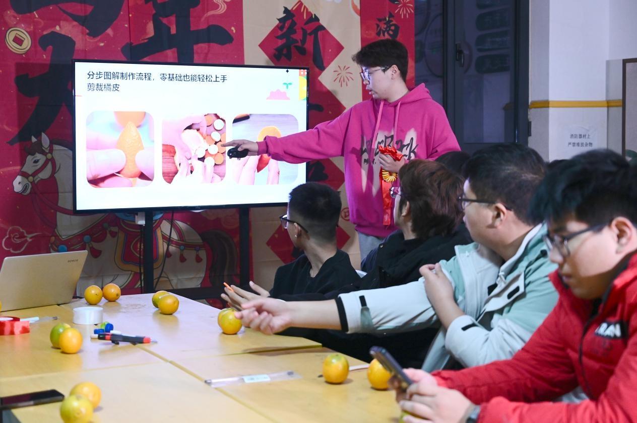 活动中,同学们在指导老师协助下,利用统一提供的针线、彩绳、铃铛等材料,系统学习利用橘子皮制作环保用品的方法,大家充分发挥创意,精心制作个性化宿舍挂件,在动手过程中深入理解资源再利用的可持续理念。活动还设置了绕口令趣味竞赛环节,有效活跃了现场气氛。